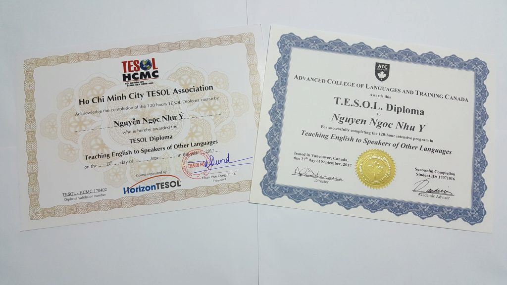 International TESOL Diploma do ATC Canada (Advanced College of Languages and Training Canada) cấp.