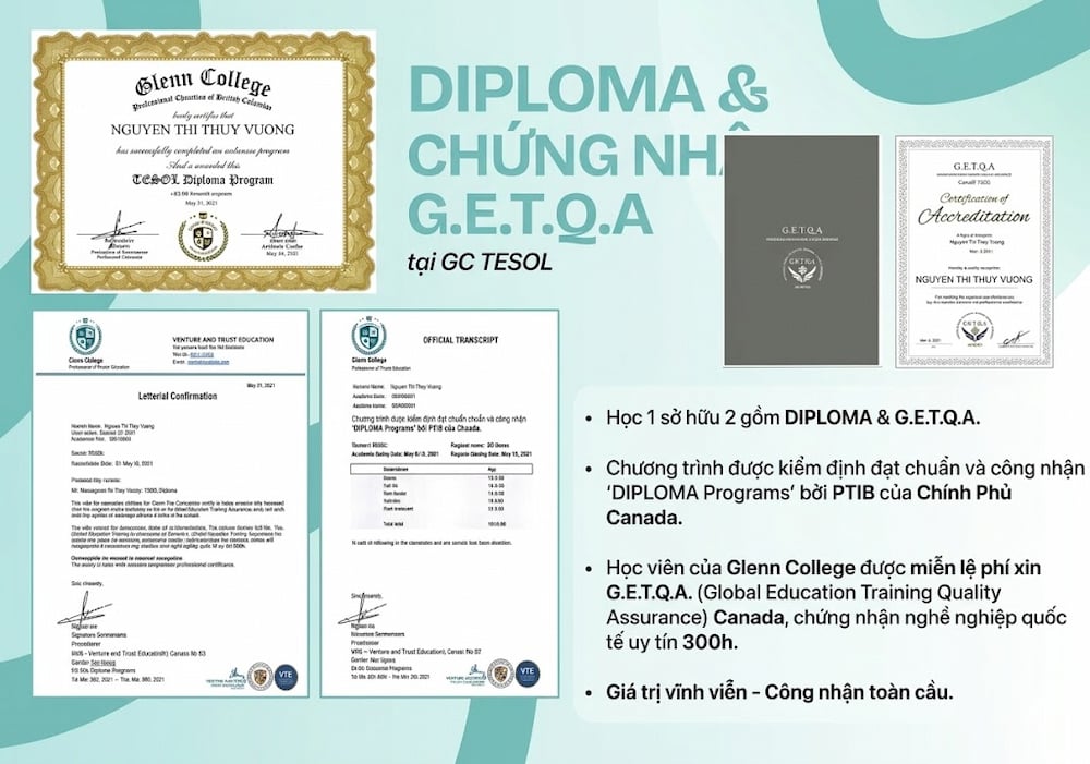 Sau khi hoàn thành, học viên nhận được TESOL Diploma 160 giờ do Glenn College cấp – một chứng chỉ quốc tế có giá trị toàn cầu.